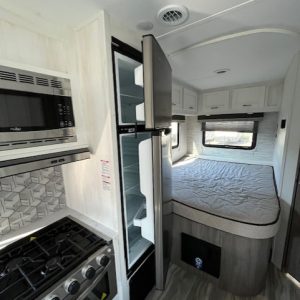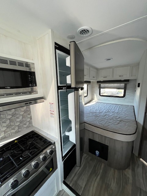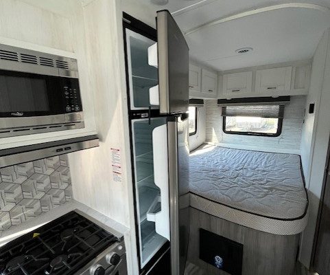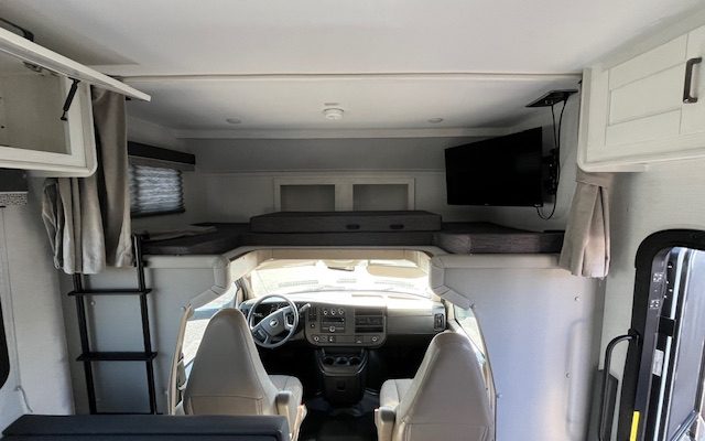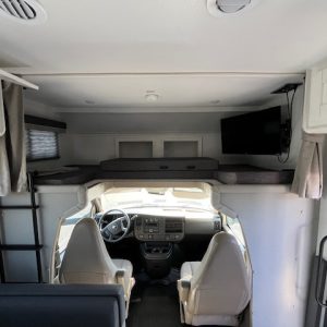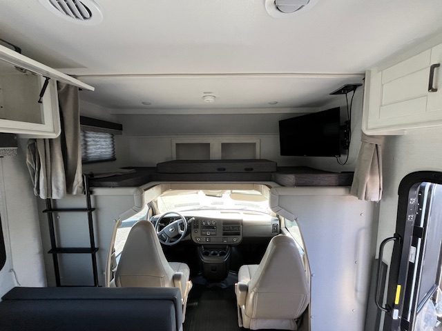 The thoughtfully designed floor plan includes bunk over cab and rear bedroom layouts, marrying function with style. Finished in a sleek white exterior with a stunning grotto interior color, this RV is not just practical but stylish as well. Key features include a flat-screen TV, auxiliary battery charger, and exterior speakers for entertainment during your stops.