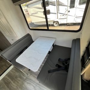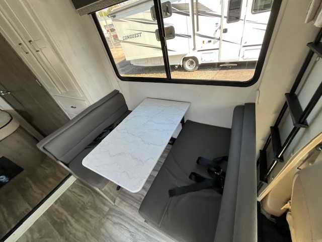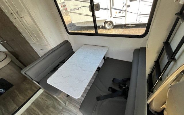 The Gulf Stream Conquest 6237 is equipped with an impressive array of features to enhance your travel experience. Enjoy home-cooked meals anytime with the full kitchen equipped with a microwave, oven, stove, and a refrigerator. The comfort continues with a comfortable queen bed and a spacious booth dinette which doubles as additional sleeping space.